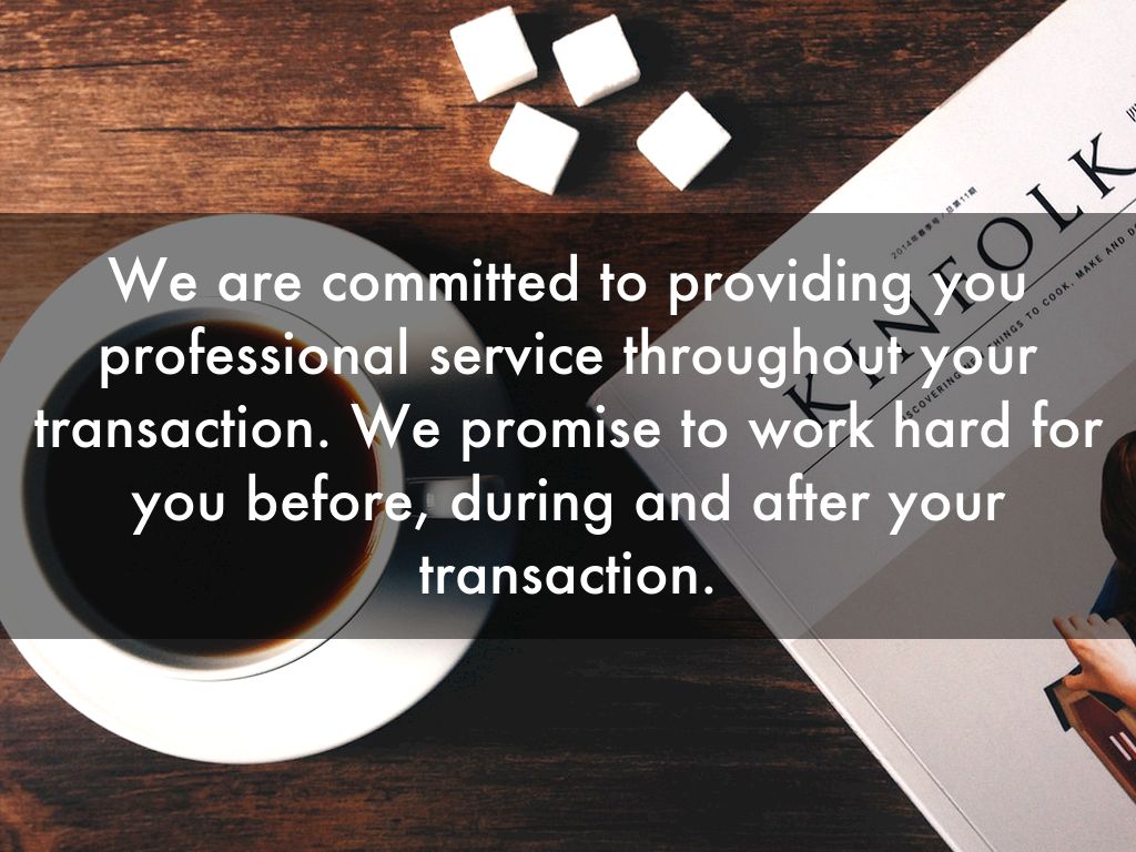 We are committed to providing you professional service throughout your transaction. We promise to work hard for you before, during and after your transaction.