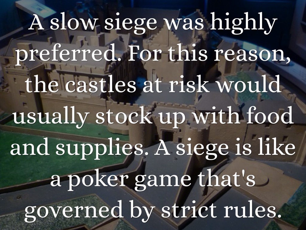 Other methods we can also try is to arm the men with scaling ladders and scale the walls of the castle when attacking. Another option is treachery, traitors within the castle could turn on the inhabitants. Our last method is starvation. An effective siege strategy if time and cost was not a problem.