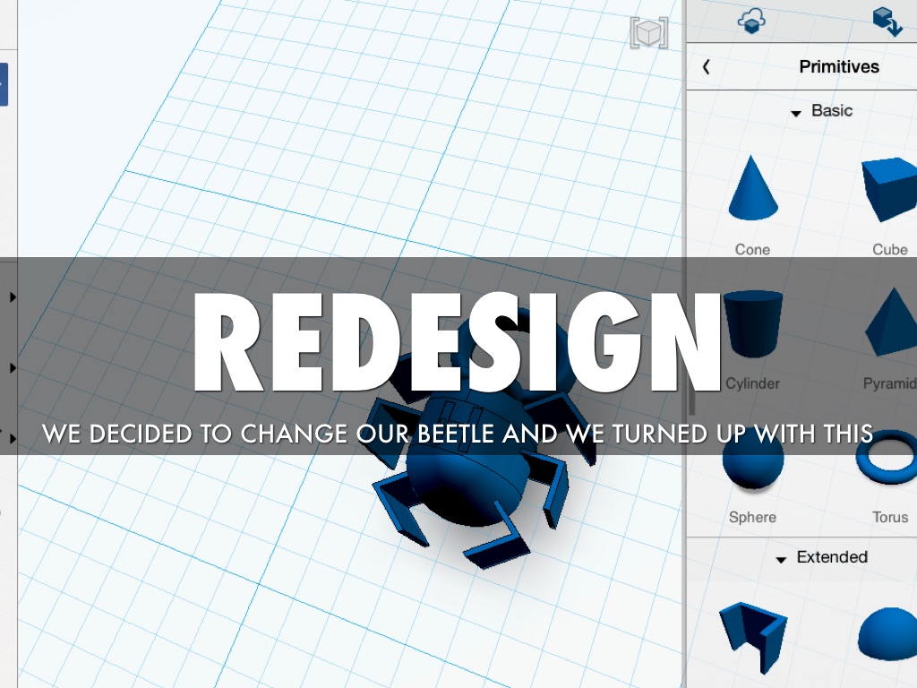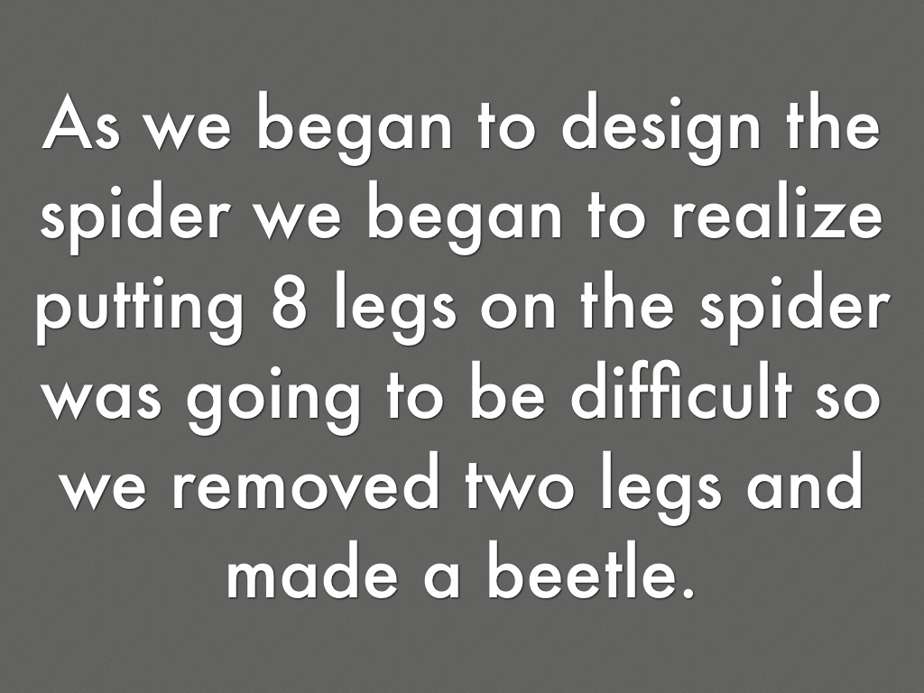 As we began to design the spider we began to realize putting 8 legs on the spider was going to be difficult so we removed two legs and made a beetle.