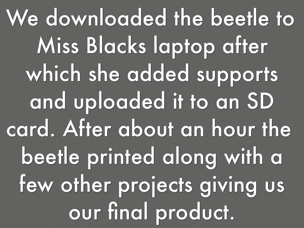 We downloaded the beetle to Miss Blacks laptop after which she added supports and uploaded it to an SD card. After about an hour the beetle printed along with a few other projects giving us our final product.