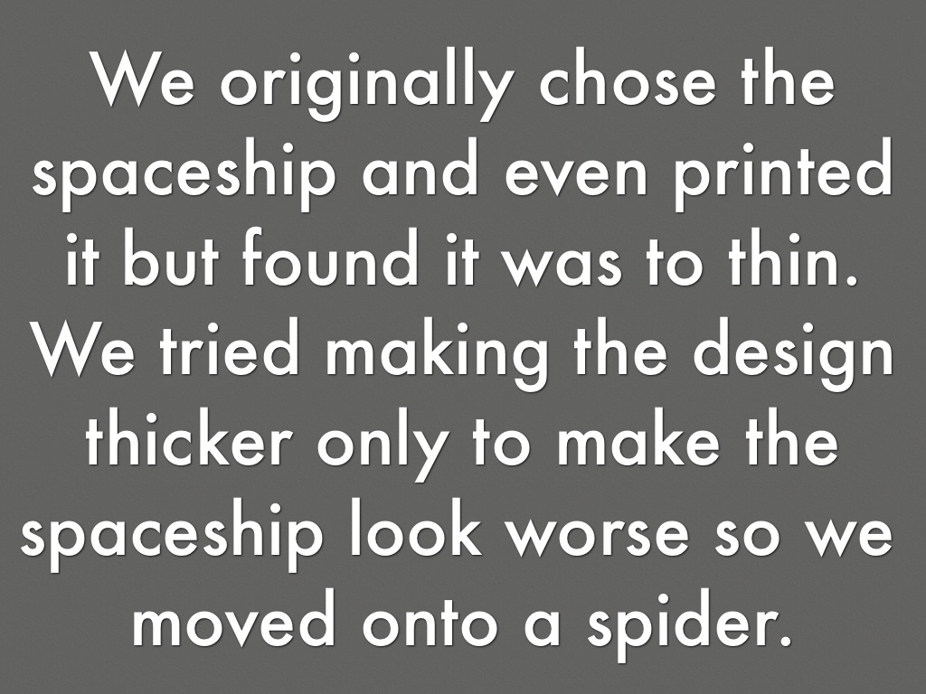We originally chose the spaceship and even printed it but found it was to thin. We tried making the design thicker only to make the spaceship look worse so we moved onto a spider.