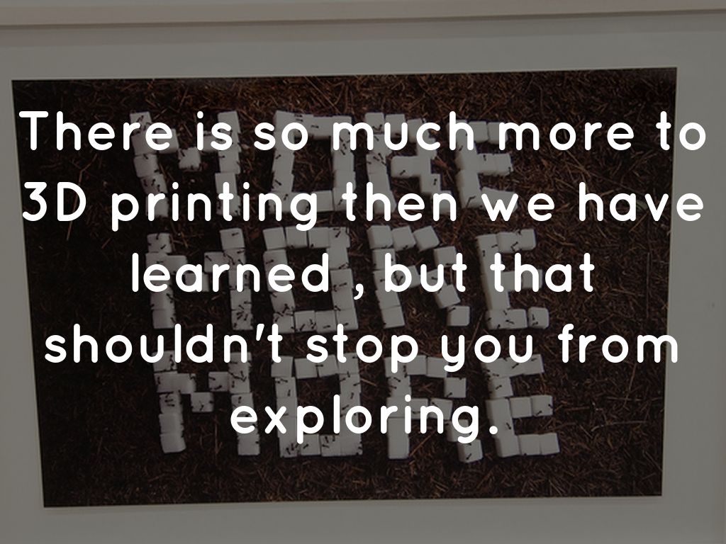 There is so much more to 3D printing then we have learned , but that shouldn't stop you from exploring.