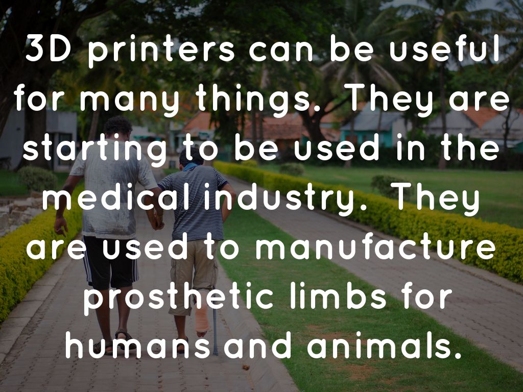 3D printers can be useful for many things. They are starting to be used in the medical industry. They are used to manufacture prosthetic limbs for humans and animals.