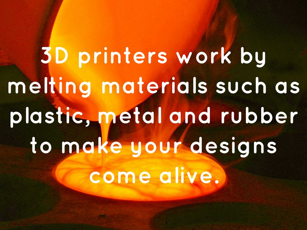 3D printers work by melting materials such as plastic, metal and rubber to make your designs come alive.