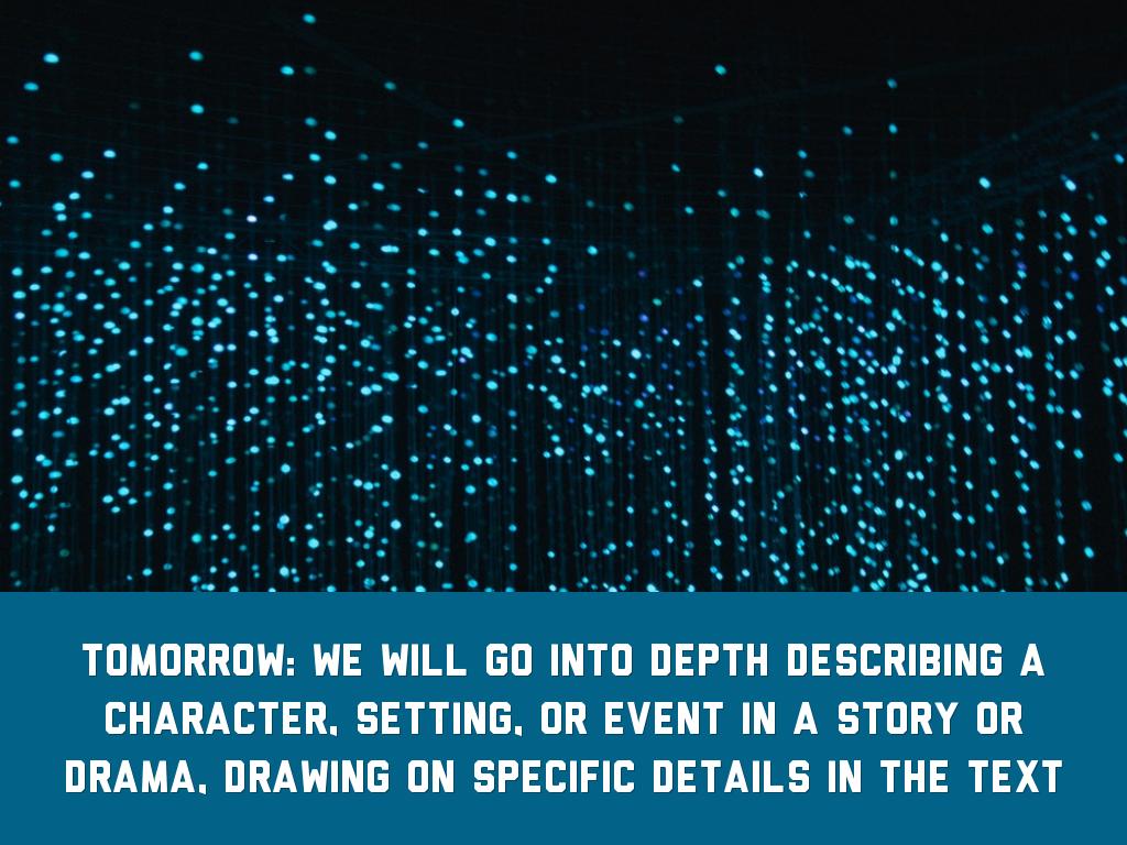 Tomorrow: we will go into depth describing a character, setting, or event in a story or drama, drawing on specific details in the text