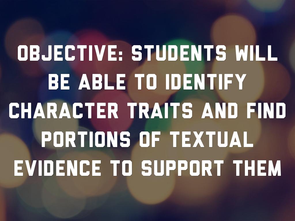 Objective: Students will be able to identify character traits and find portions of textual evidence to support them