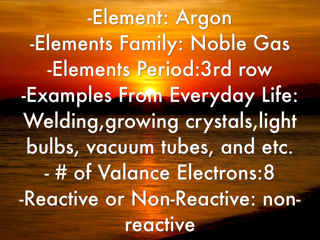 -Element: Argon -Elements Family: Noble Gas -Elements Period:3rd row -Examples From Everyday Life: Welding,growing crystals,light bulbs, vacuum tubes, and etc. - # of Valance Electrons:8 -Reactive or Non-Reactive: non-reactive
