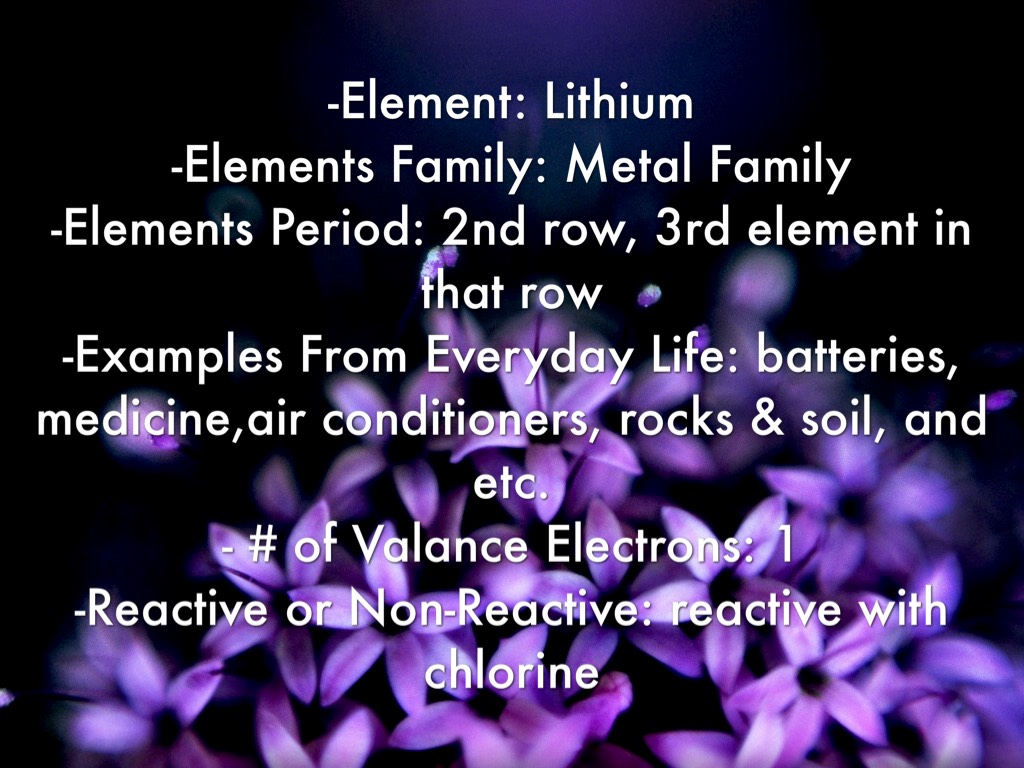 -Element: Lithium -Elements Family: Metal Family -Elements Period: 2nd row, 3rd element in that row -Examples From Everyday Life: batteries, medicine,air conditioners, rocks & soil, and etc. - # of Valance Electrons: 1 -Reactive or Non-Reactive: reactive with chlorine