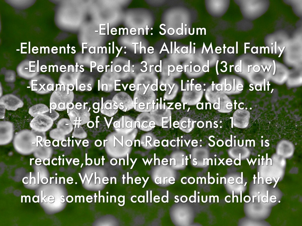 -Element: Sodium -Elements Family: The Alkali Metal Family -Elements Period: 3rd period (3rd row) -Examples In Everyday Life: table salt, paper,glass, fertilizer, and etc.. - # of Valance Electrons: 1 -Reactive or Non-Reactive: Sodium is reactive,but only when it's mixed with chlorine.When they are combined, they make something called sodium chloride.
