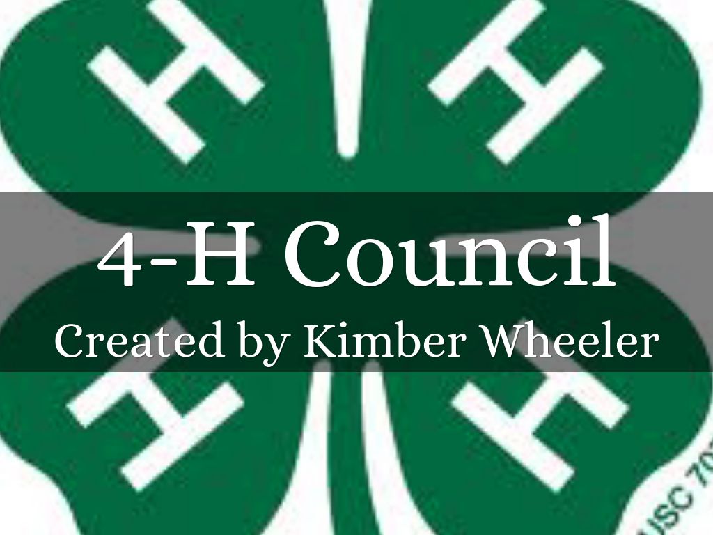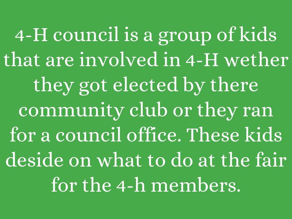 4-H council is a group of kids that are involved in 4-H wether they got elected by there community club or they ran for a council office. These kids deside on what to do at the fair for the 4-h members.
