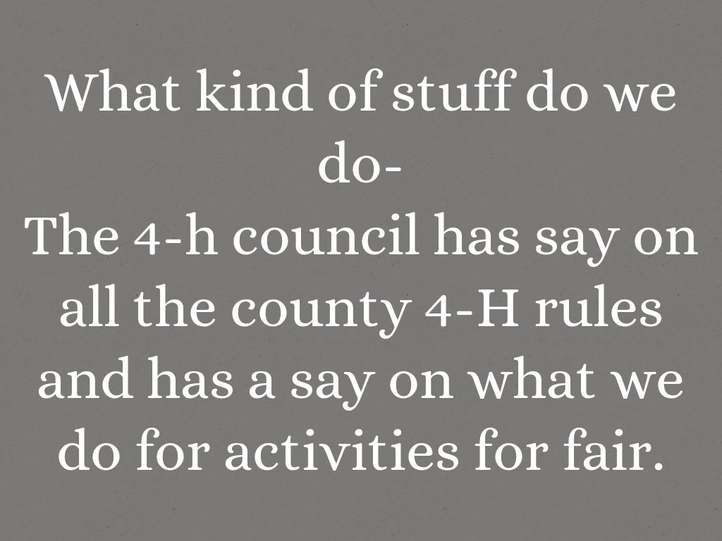 The 4-h council has say on all the county 4-H rules and has a say on what we do for activities for fair.