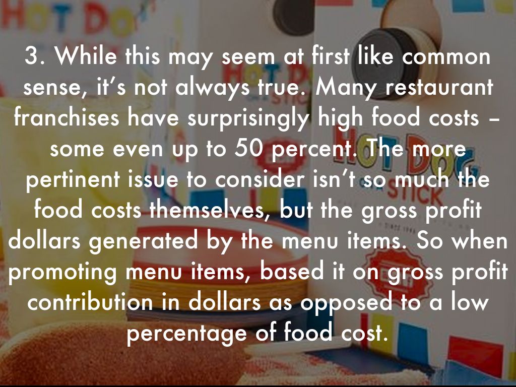 3. While this may seem at first like common sense, it’s not always true. Many restaurant franchises have surprisingly high food costs – some even up to 50 percent. The more pertinent issue to consider isn’t so much the food costs themselves, but the gross profit dollars generated by the menu items. So when promoting menu items, based it on gross profit contribution in dollars as opposed to a low percentage of food cost.