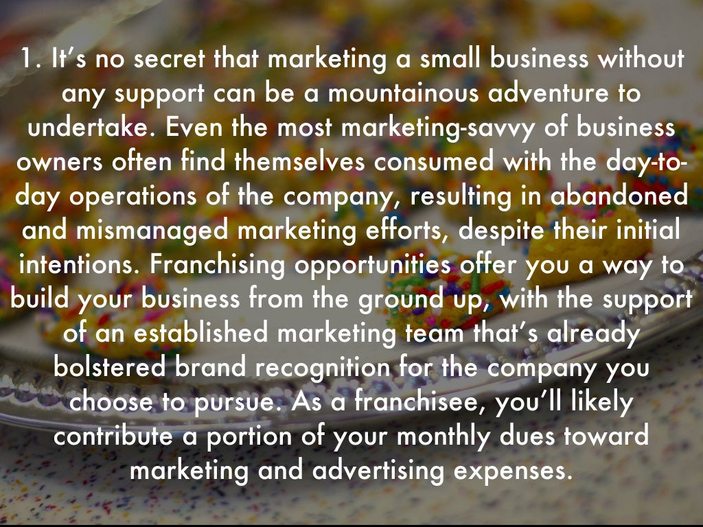 1. It’s no secret that marketing a small business without any support can be a mountainous adventure to undertake. Even the most marketing-savvy of business owners often find themselves consumed with the day-to-day operations of the company, resulting in abandoned and mismanaged marketing efforts, despite their initial intentions. Franchising opportunities offer you a way to build your business from the ground up, with the support of an established marketing team that’s already bolstered brand recognition for the company you choose to pursue. As a franchisee, you’ll likely contribute a portion of your monthly dues toward marketing and advertising expenses.