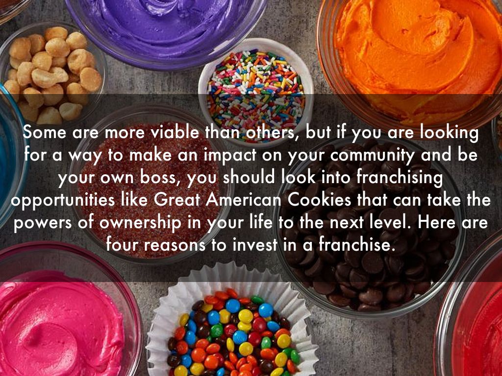 Some are more viable than others, but if you are looking for a way to make an impact on your community and be your own boss, you should look into franchising opportunities like Great American Cookies that can take the powers of ownership in your life to the next level. Here are four reasons to invest in a franchise.