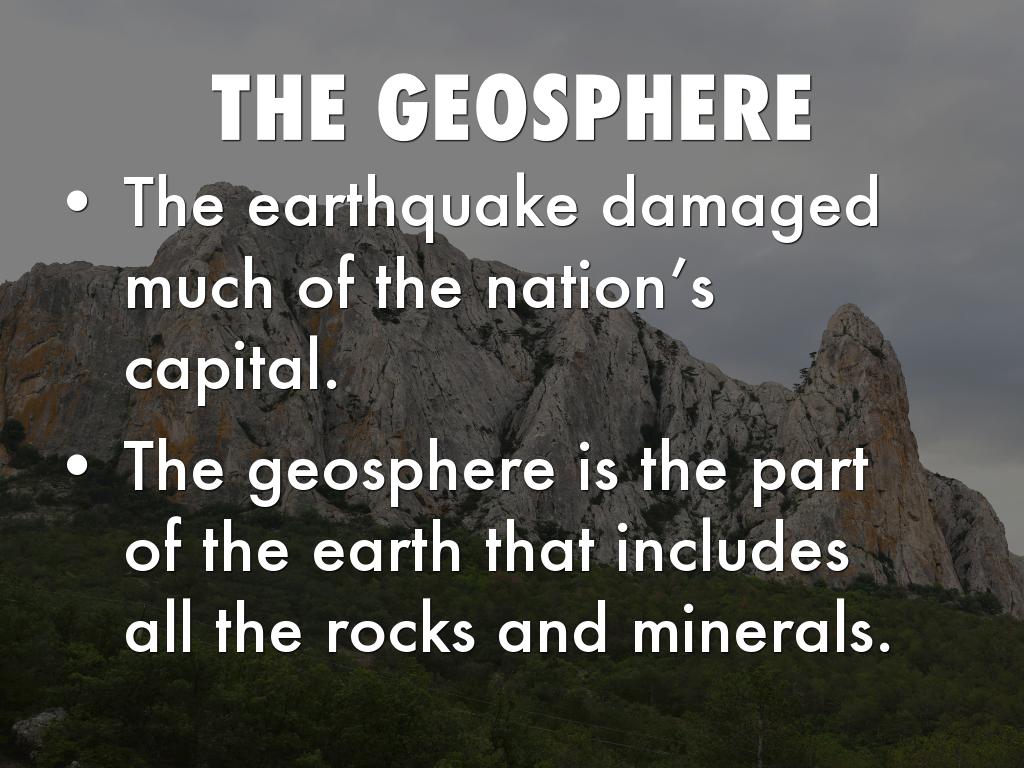 • The geosphere is the part of the earth that includes all the rocks and minerals.