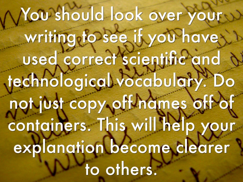 You should look over your writing to see if you have used correct scientific and technological vocabulary. Do not just copy off names off of containers. This will help your explanation become clearer to others.