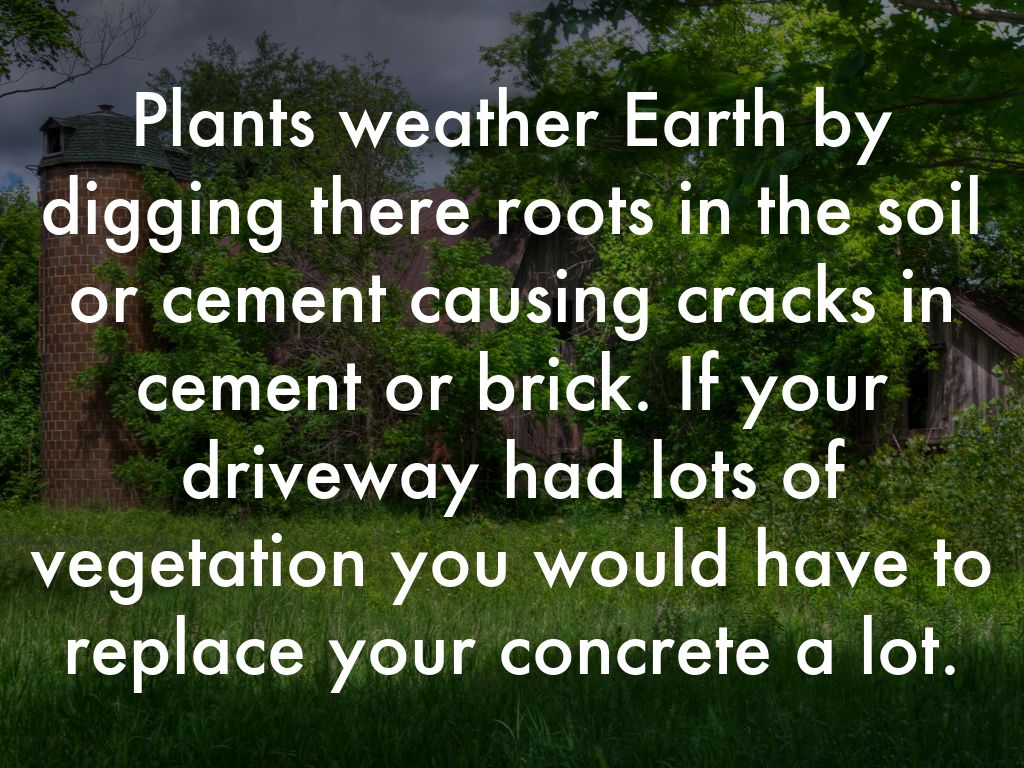 Plants weather Earth by digging there roots in the soil or cement causing cracks in cement or brick. If your driveway had lots of vegetation you would have to replace your concrete a lot.