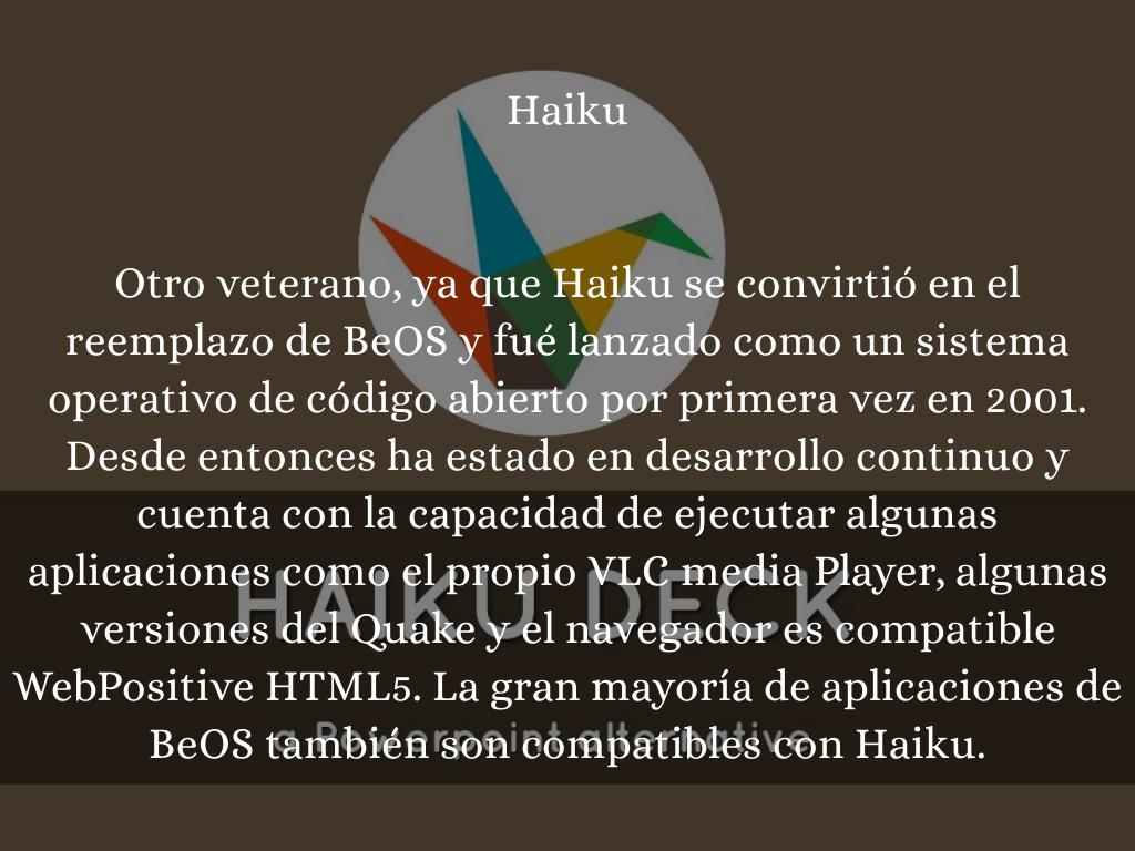 Otro veterano, ya que Haiku se convirtió en el reemplazo de BeOS y fué lanzado como un sistema operativo de código abierto por primera vez en 2001. Desde entonces ha estado en desarrollo continuo y cuenta con la capacidad de ejecutar algunas aplicaciones como el propio VLC media Player, algunas versiones del Quake y el navegador es compatible WebPositive HTML5. La gran mayoría de aplicaciones de BeOS también son compatibles con Haiku.