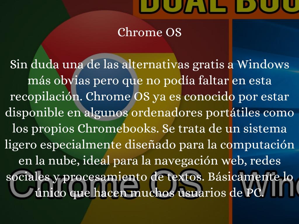 Sin duda una de las alternativas gratis a Windows más obvias pero que no podía faltar en esta recopilación. Chrome OS ya es conocido por estar disponible en algunos ordenadores portátiles como los propios Chromebooks. Se trata de un sistema ligero especialmente diseñado para la computación en la nube, ideal para la navegación web, redes sociales y procesamiento de textos. Básicamente lo único que hacen muchos usuarios de PC.