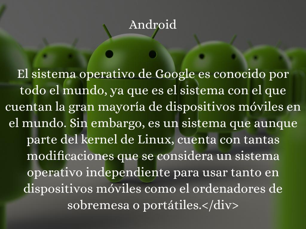 El sistema operativo de Google es conocido por todo el mundo, ya que es el sistema con el que cuentan la gran mayoría de dispositivos móviles en el mundo. Sin embargo, es un sistema que aunque parte del kernel de Linux, cuenta con tantas modificaciones que se considera un sistema operativo independiente para usar tanto en dispositivos móviles como el ordenadores de sobremesa o portátiles.