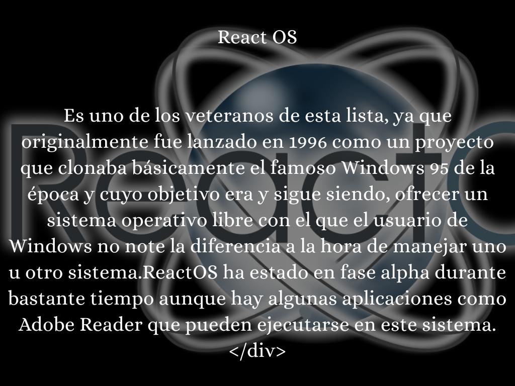 Es uno de los veteranos de esta lista, ya que originalmente fue lanzado en 1996 como un proyecto que clonaba básicamente el famoso Windows 95 de la época y cuyo objetivo era y sigue siendo, ofrecer un sistema operativo libre con el que el usuario de Windows no note la diferencia a la hora de manejar uno u otro sistema.ReactOS ha estado en fase alpha durante bastante tiempo aunque hay algunas aplicaciones como Adobe Reader que pueden ejecutarse en este sistema.
