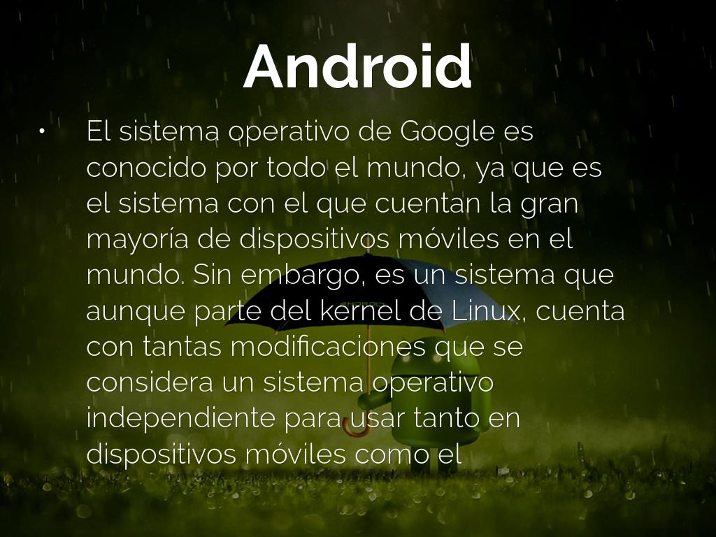 El sistema operativo de Google es conocido por todo el mundo, ya que es el sistema con el que cuentan la gran mayoría de dispositivos móviles en el mundo. Sin embargo, es un sistema que aunque parte del kernel de Linux, cuenta con tantas modificaciones que se considera un sistema operativo independiente para usar tanto en dispositivos móviles como el ordenadores de sobremesa o portátiles.