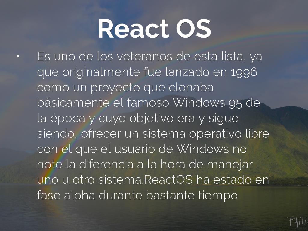Es uno de los veteranos de esta lista, ya que originalmente fue lanzado en 1996 como un proyecto que clonaba básicamente el famoso Windows 95 de la época y cuyo objetivo era y sigue siendo, ofrecer un sistema operativo libre con el que el usuario de Windows no note la diferencia a la hora de manejar uno u otro sistema.ReactOS ha estado en fase alpha durante bastante tiempo aunque hay algunas aplicaciones como Adobe Reader que pueden ejecutarse en este sistema. Está disponible para su prueba en este mismo enlace.