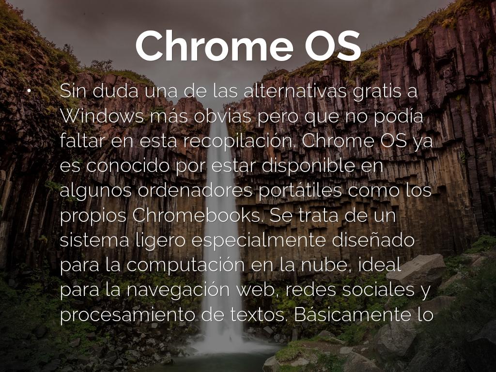 Sin duda una de las alternativas gratis a Windows más obvias pero que no podía faltar en esta recopilación. Chrome OS ya es conocido por estar disponible en algunos ordenadores portátiles como los propios Chromebooks. Se trata de un sistema ligero especialmente diseñado para la computación en la nube, ideal para la navegación web, redes sociales y procesamiento de textos. Básicamente lo único que hacen muchos usuarios de PC. Puedes saber algo más sobre Chrome OS y descargarlo para su prueba desde este mismo enlace.