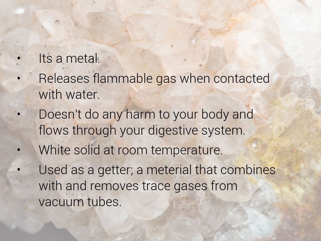 • Used as a getter; a meterial that combines with and removes trace gases from vacuum tubes.