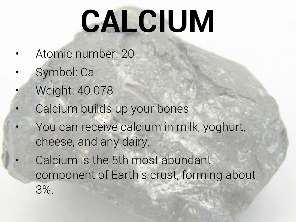• Calcium is the 5th most abundant component of Earth's crust, forming about 3%.