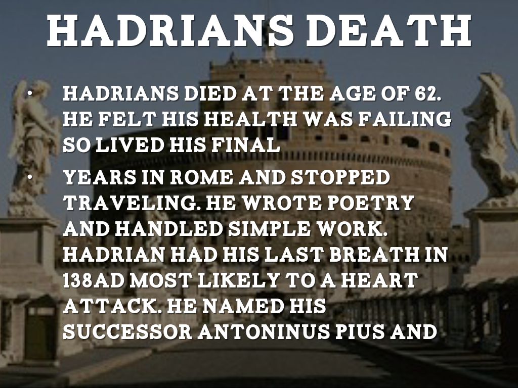 Years in Rome and stopped traveling. He wrote poetry and handled simple work. Hadrian had his last breath in 138Ad most likely to a heart attack. He named his successor Antoninus pius and assuming that Antoninus would adopt Marcus aurelius (which he did). He was originally buried on the ground where a college was once kept in honor of his love of learning, but once Pius became emperor he made a magnificent tomb and cremated him with his wife.