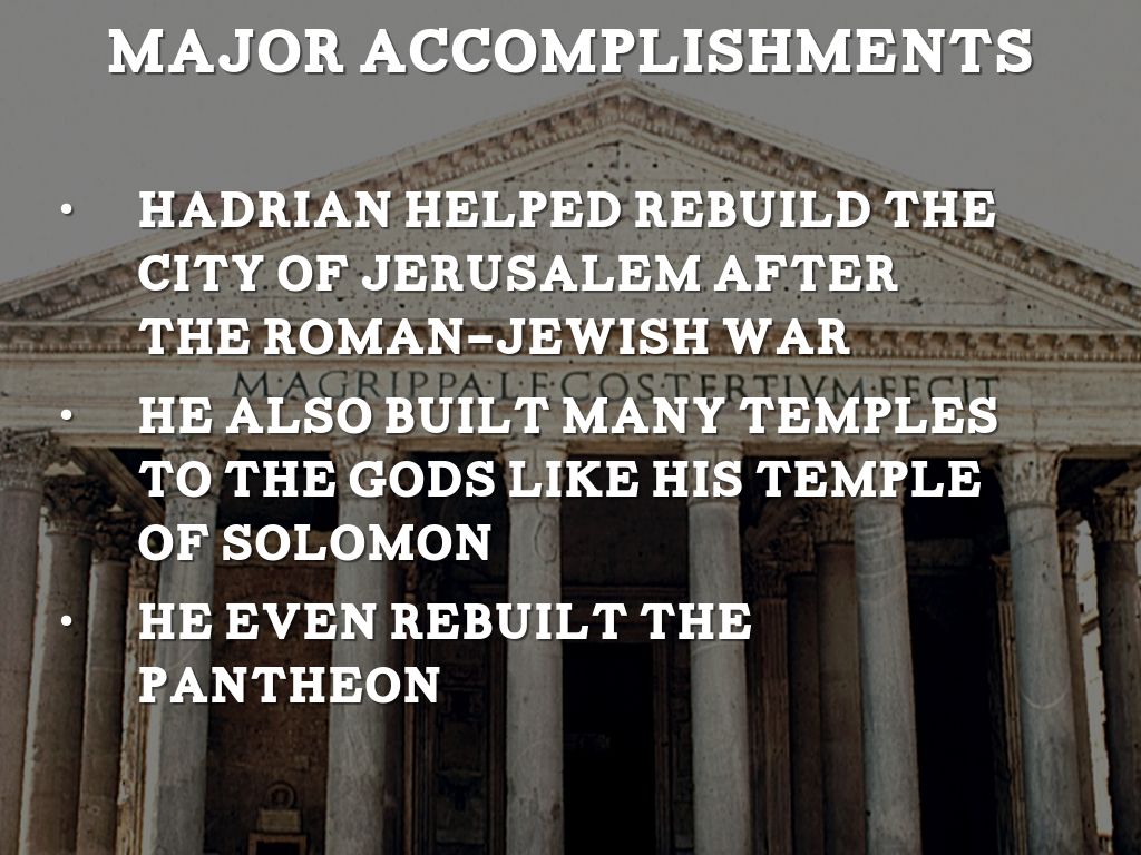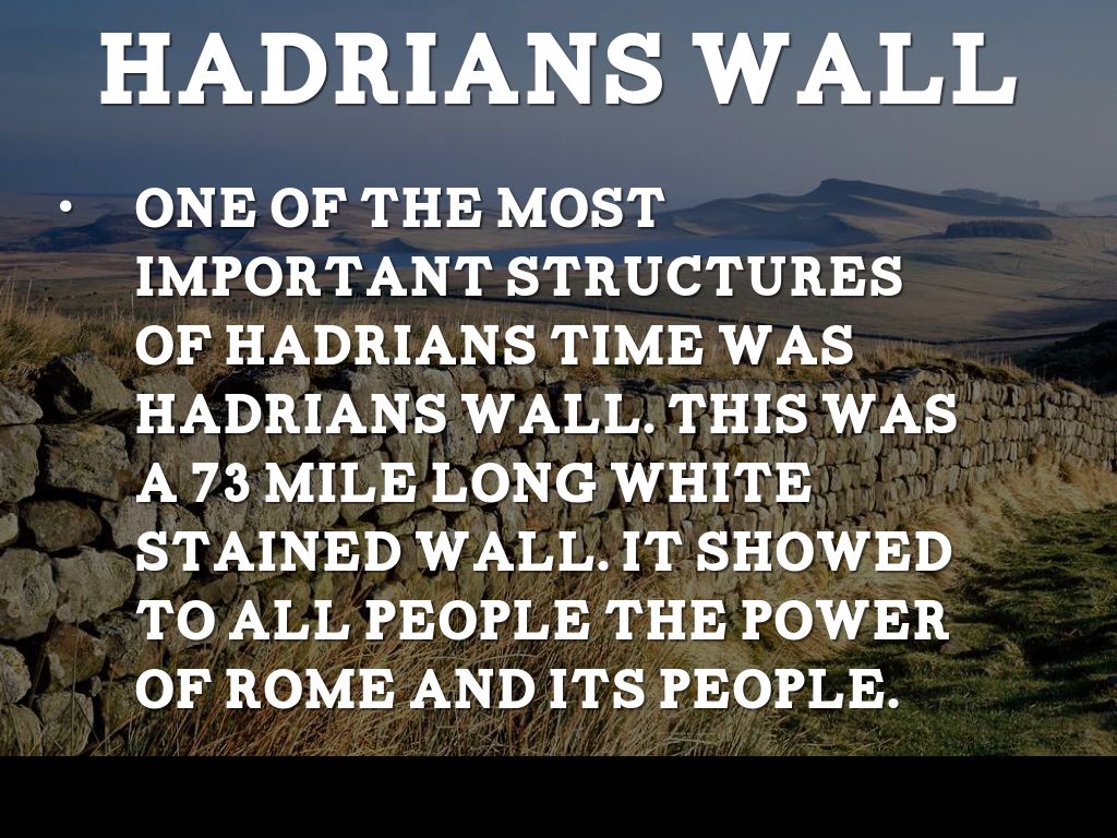 One of the most important structures of hadrians time was hadrians wall. This was a 73 mile long white stained wall. It showed to all people the power of Rome and its people.