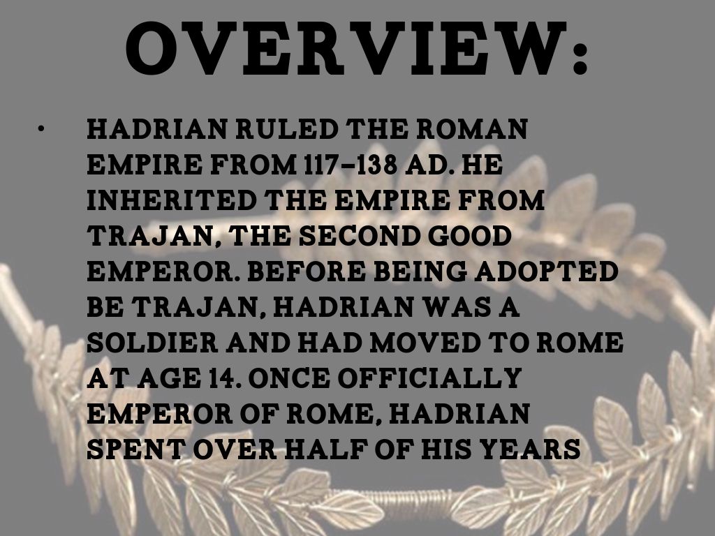 Hadrian ruled the Roman Empire from 117-138 AD. He inherited the empire from Trajan, the second good emperor. Before being adopted be Trajan, Hadrian was a soldier and had moved to Rome at age 14. Once officially Emperor of Rome, Hadrian spent over half of his years traveling the empire, overseeing work and being with his people.