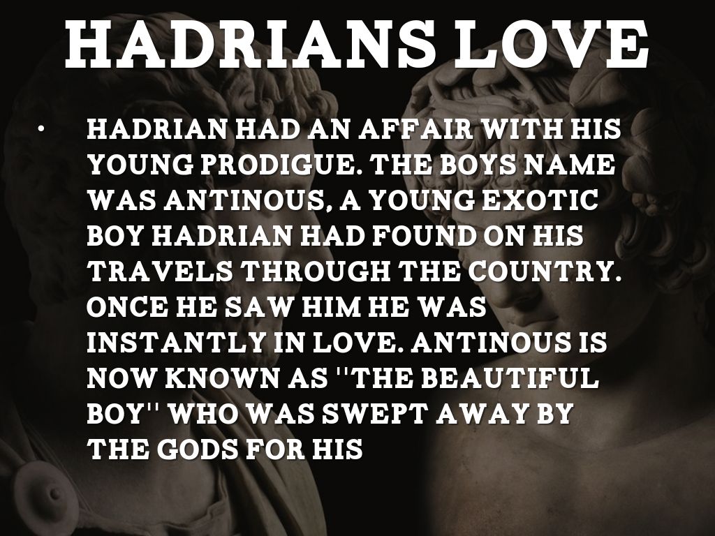 Hadrian had an affair with his young prodigue. The boys name was antinous, a young exotic boy Hadrian had found on his travels through the country. Once he saw him he was instantly in love. Antinous is now known as ''the beautiful boy'' who was swept away by the gods for his attractiveness. The truth is he drowned in a river which emotionally destroyed Hadrian. He then names the river antinopis in honor of the boy.