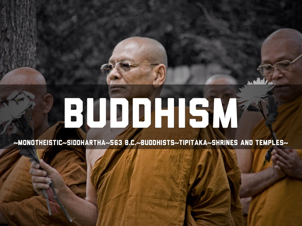 ~MONOTHEISTIC~SIDDHARTHA~563 B.C.~BUDDHISTS~TIPITAKA~SHRINES AND TEMPLES~