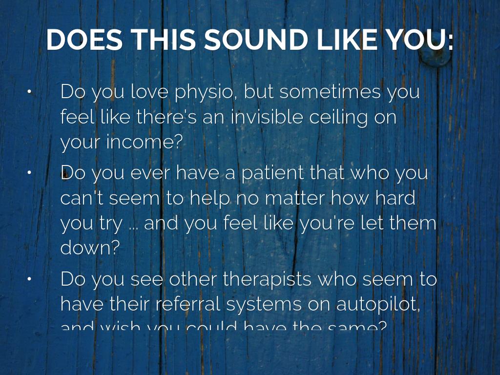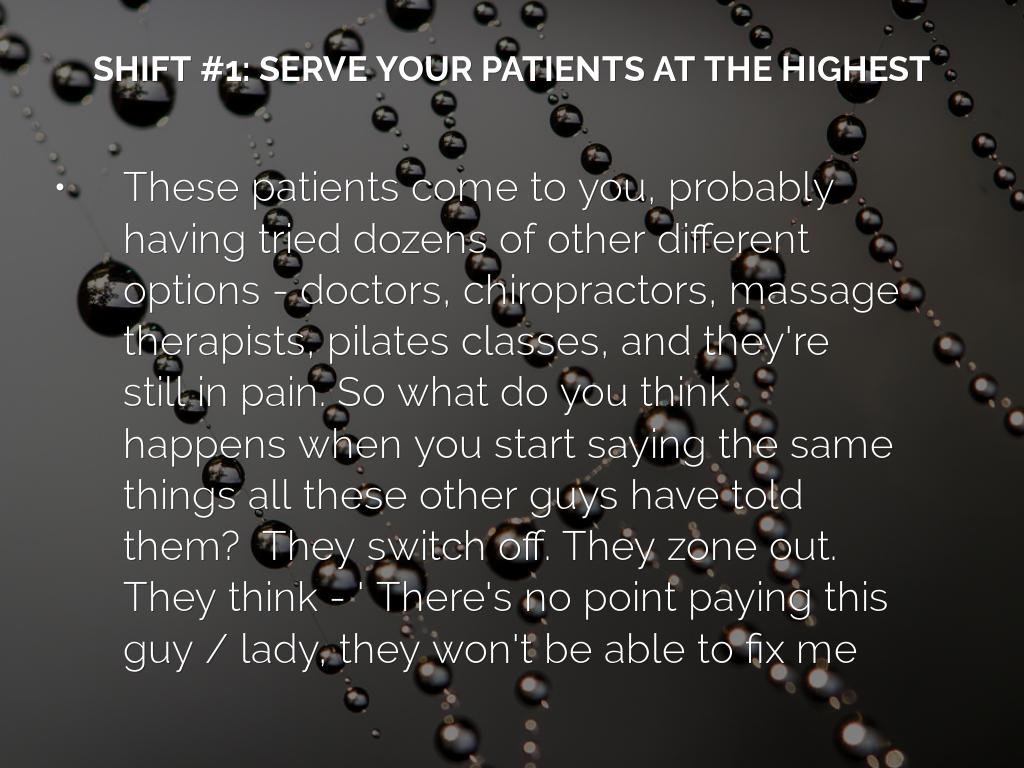 These patients come to you, probably having tried dozens of other different options - doctors, chiropractors, massage therapists, pilates classes, and they're still in pain. So what do you think happens when you start saying the same things all these other guys have told them? They switch off. They zone out. They think - ' There's no point paying this guy / lady, they won't be able to fix me either.'