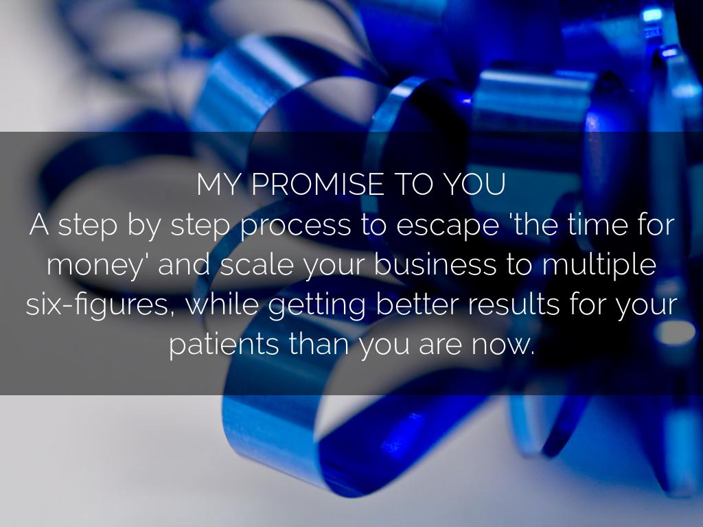 MY PROMISE TO YOU A step by step process to escape 'the time for money' and scale your business to multiple six-figures, while getting better results for your patients than you are now.