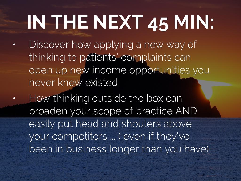 How thinking outside the box can broaden your scope of practice AND easily put head and shoulers above your competitors ... ( even if they've been in business longer than you have)