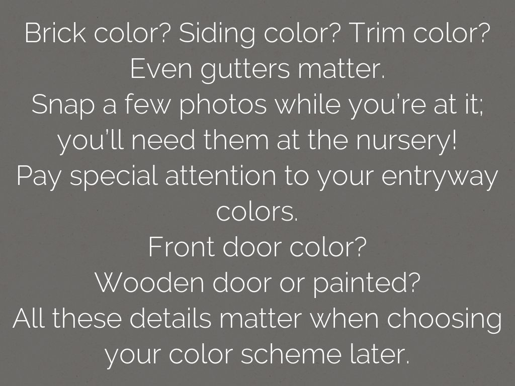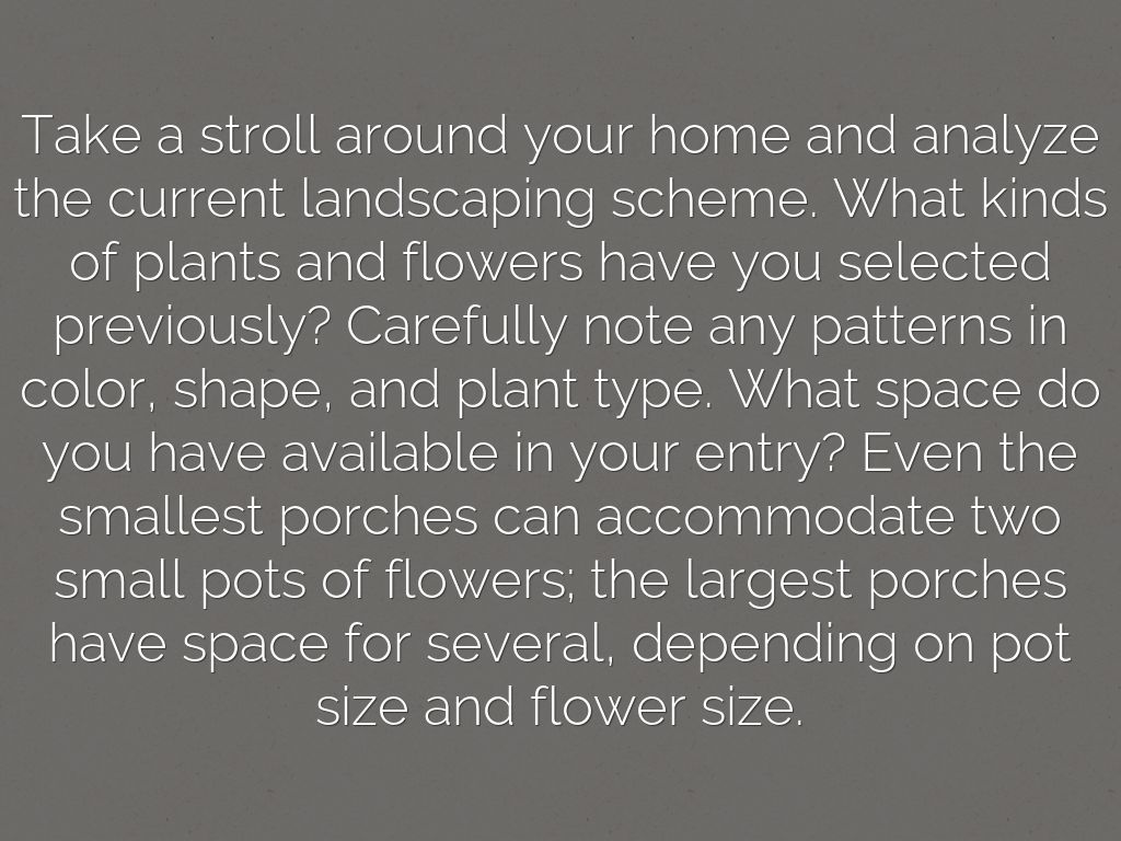 Take a stroll around your home and analyze the current landscaping scheme. What kinds of plants and flowers have you selected previously? Carefully note any patterns in color, shape, and plant type. What space do you have available in your entry? Even the smallest porches can accommodate two small pots of flowers; the largest porches have space for several, depending on pot size and flower size.