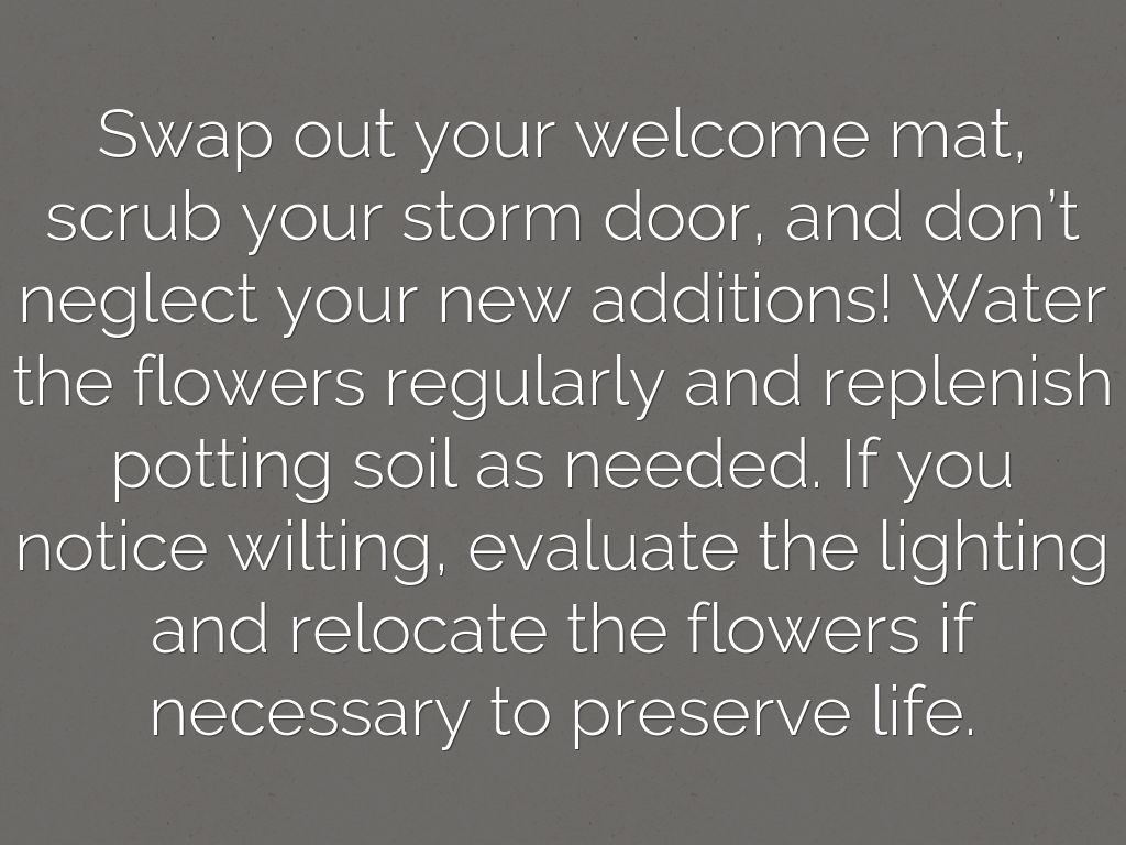 Swap out your welcome mat, scrub your storm door, and don’t neglect your new additions! Water the flowers regularly and replenish potting soil as needed. If you notice wilting, evaluate the lighting and relocate the flowers if necessary to preserve life.