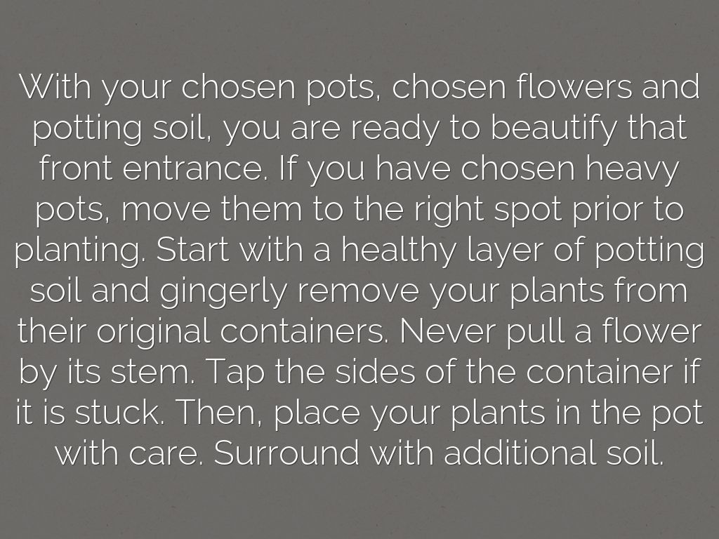 With your chosen pots, chosen flowers and potting soil, you are ready to beautify that front entrance. If you have chosen heavy pots, move them to the right spot prior to planting. Start with a healthy layer of potting soil and gingerly remove your plants from their original containers. Never pull a flower by its stem. Tap the sides of the container if it is stuck. Then, place your plants in the pot with care. Surround with additional soil.
