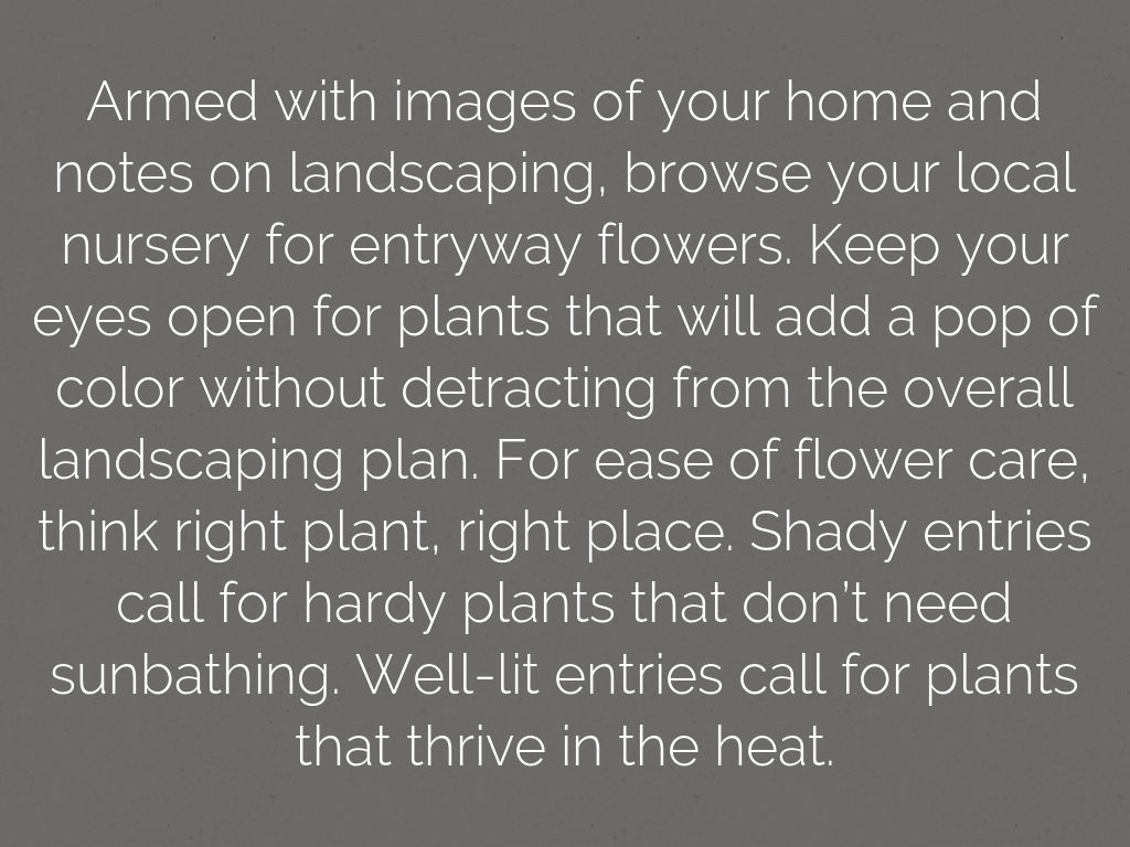 Armed with images of your home and notes on landscaping, browse your local nursery for entryway flowers. Keep your eyes open for plants that will add a pop of color without detracting from the overall landscaping plan. For ease of flower care, think right plant, right place. Shady entries call for hardy plants that don’t need sunbathing. Well-lit entries call for plants that thrive in the heat.