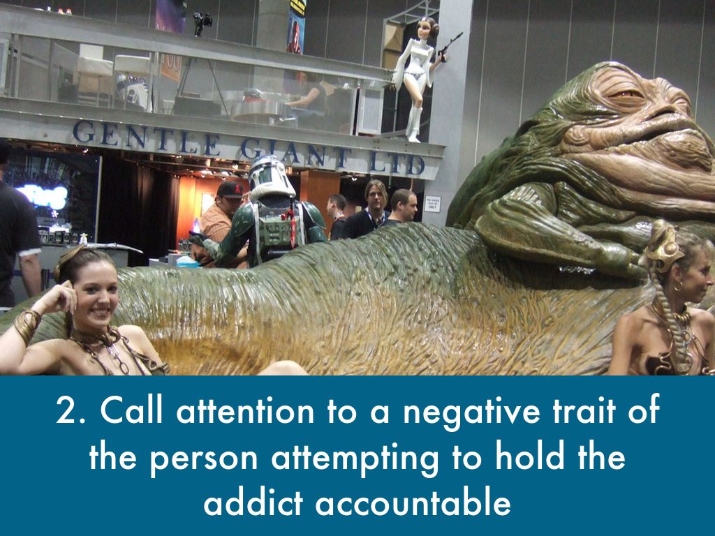 2. Call attention to a negative trait of the person attempting to hold the addict accountable