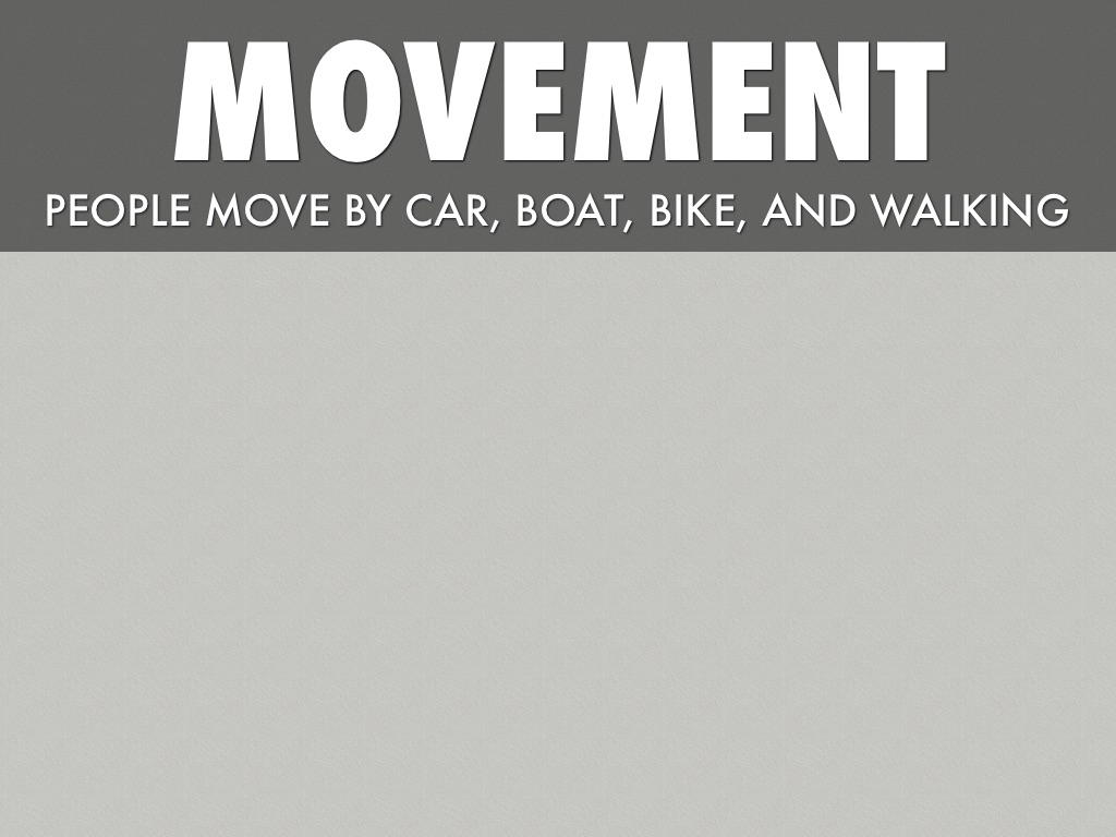 PEOPLE MOVE BY CAR, BOAT, BIKE, AND WALKING