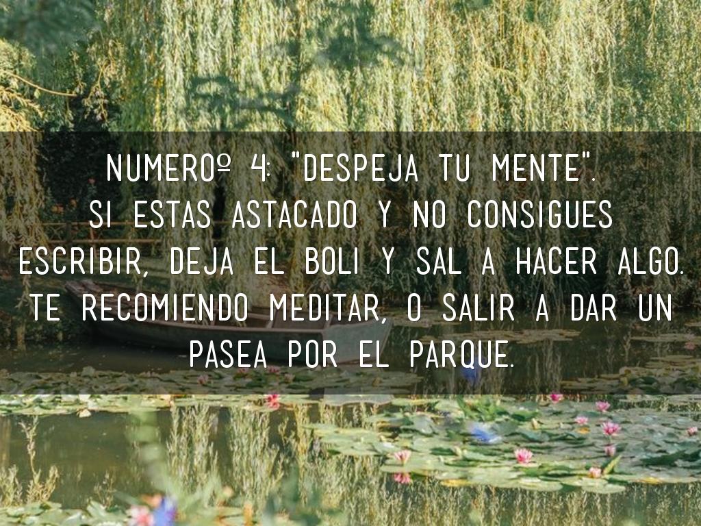 SI estas astacado y no consigues escribir, deja el boli y sal a hacer algo. Te recomiendo meditar, o salir a dar un pasea por el parque.