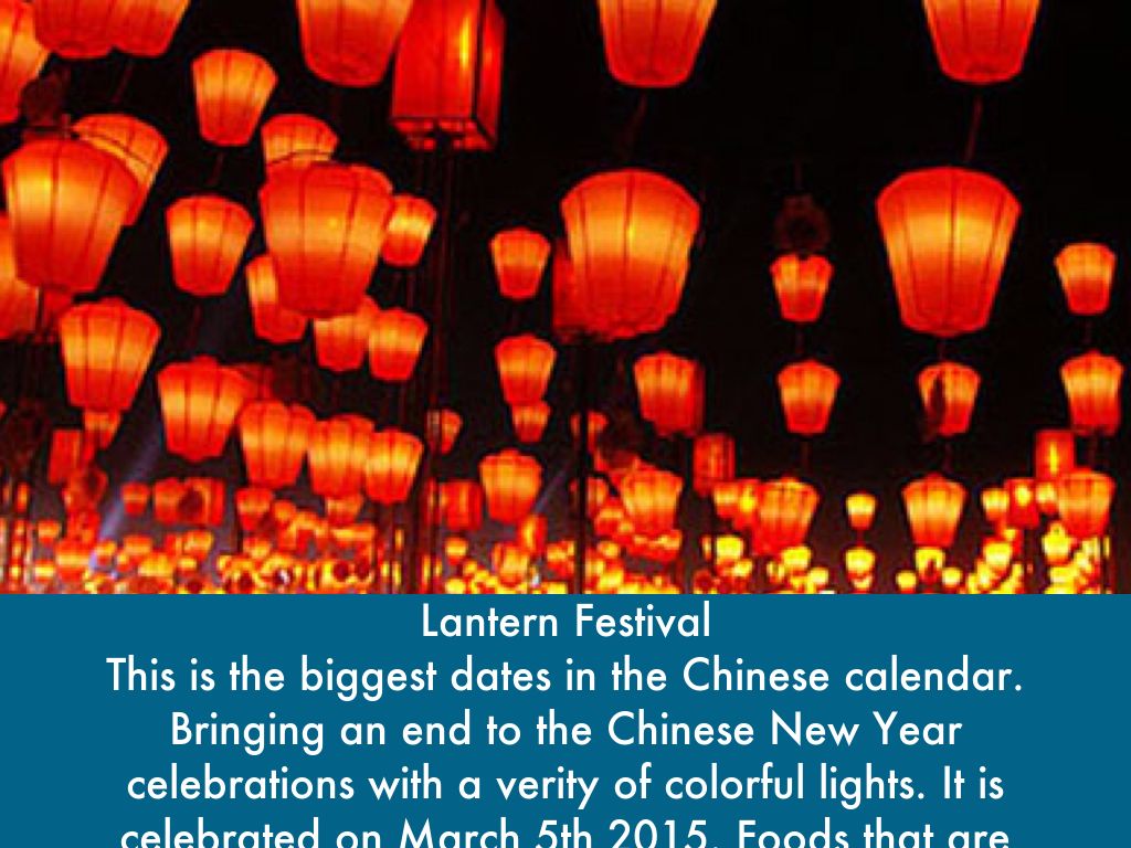 This is the biggest dates in the Chinese calendar. Bringing an end to the Chinese New Year celebrations with a verity of colorful lights. It is celebrated on March 5th 2015. Foods that are survey are dumplings, glutinous rice flour, sugar, brown sugar, peanuts, rose petals and more