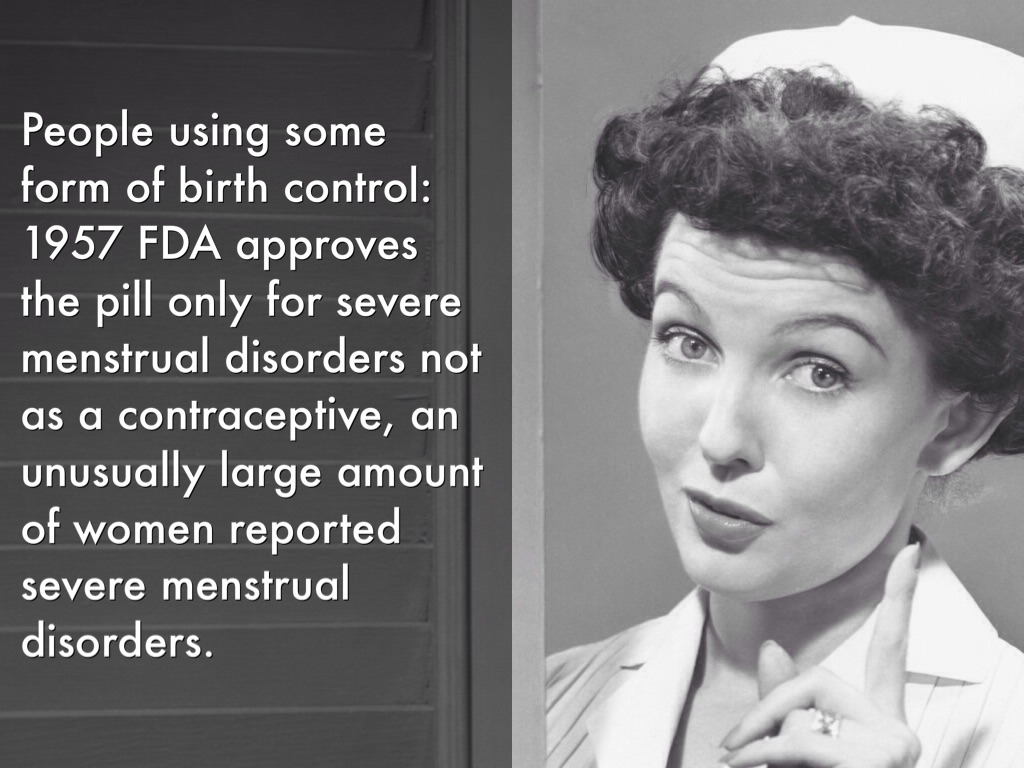 1957 FDA approves the pill only for severe menstrual disorders not as a contraceptive, an unusually large amount of women reported severe menstrual disorders.
