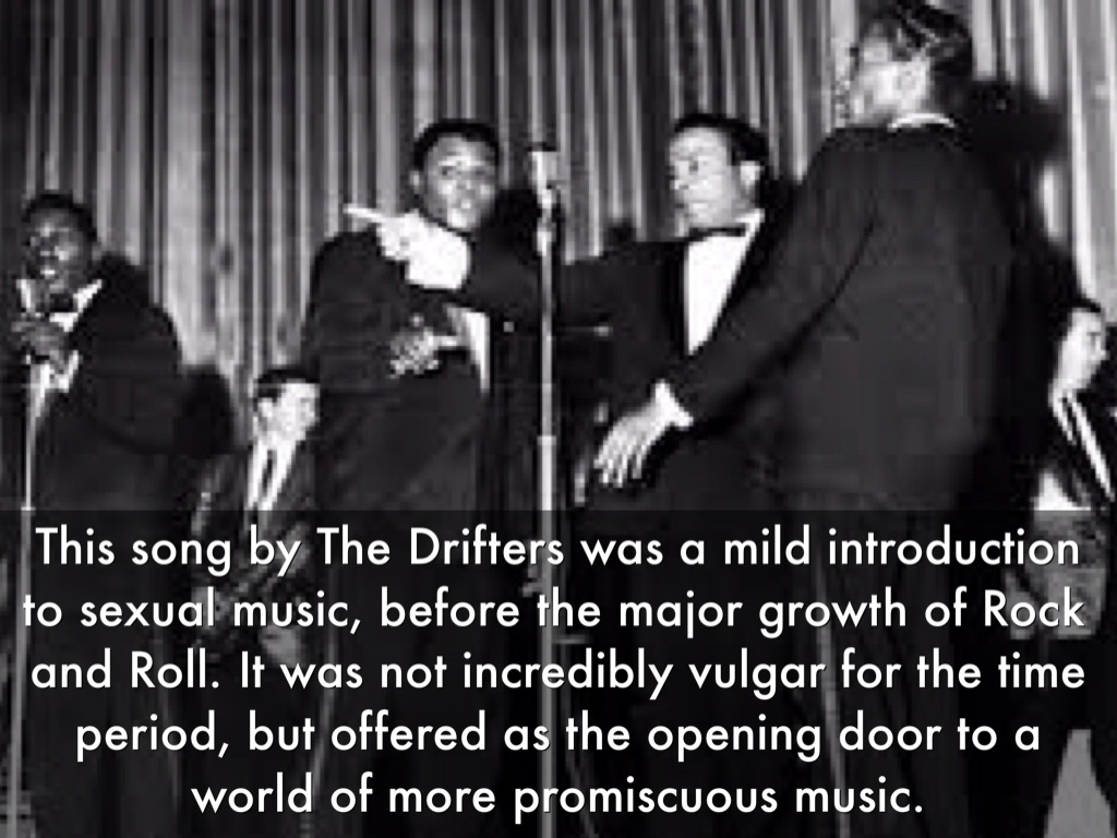 This song by The Drifters was a mild introduction to sexual music, before the major growth of Rock and Roll. It was not incredibly vulgar for the time period, but offered as the opening door to a world of more promiscuous music.