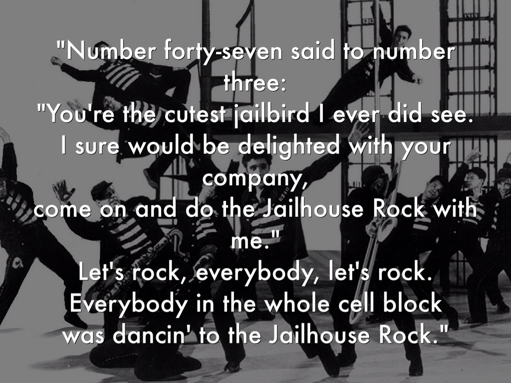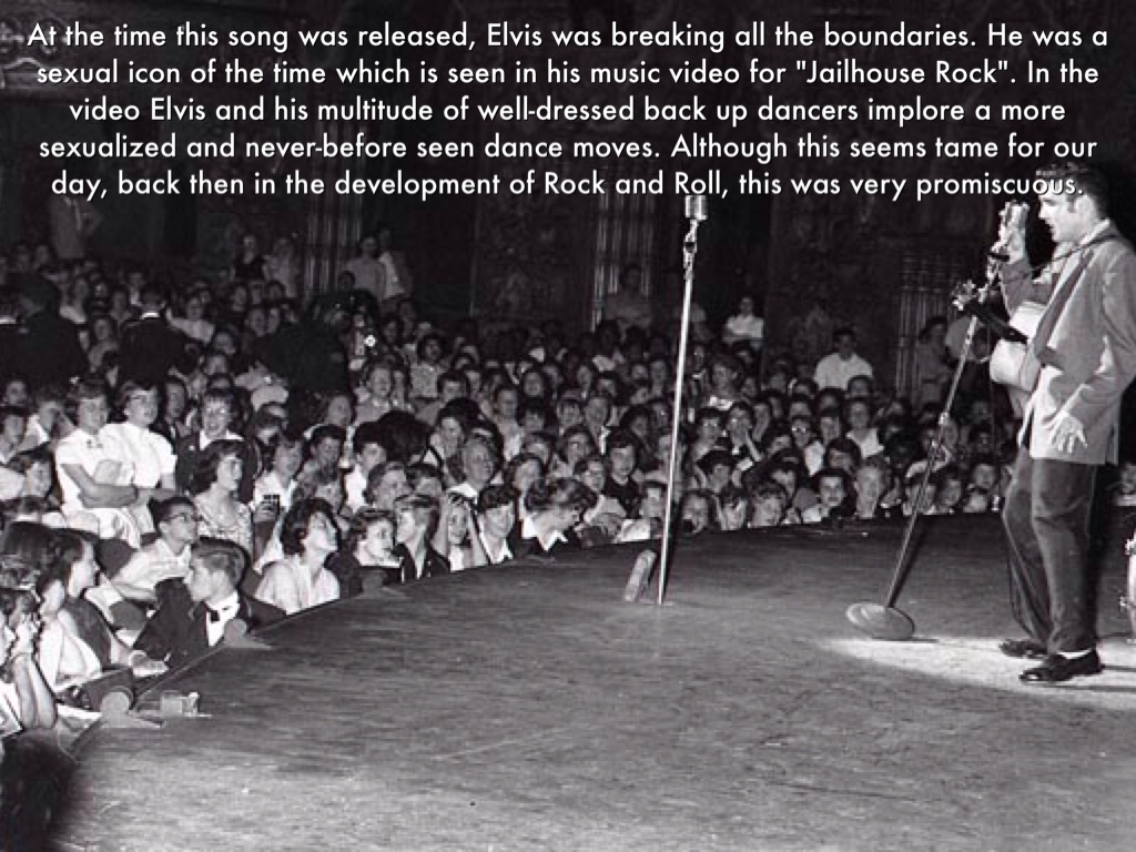 At the time this song was released, Elvis was breaking all the boundaries. He was a sexual icon of the time which is seen in his music video for "Jailhouse Rock". In the video Elvis and his multitude of well-dressed back up dancers implore a more sexualized and never-before seen dance moves. Although this seems tame for our day, back then in the development of Rock and Roll, this was very promiscuous.
