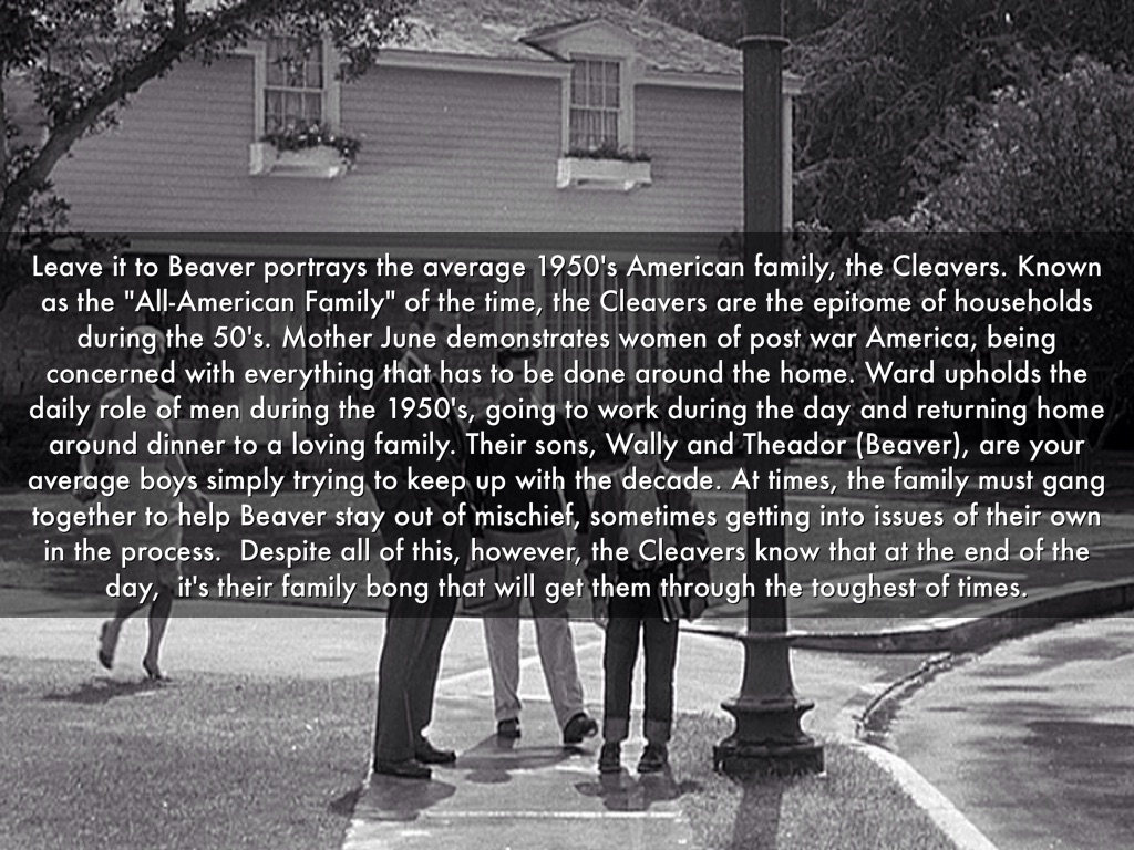 Leave it to Beaver portrays the average 1950's American family, the Cleavers. Known as the "All-American Family" of the time, the Cleavers are the epitome of households during the 50's. Mother June demonstrates women of post war America, being concerned with everything that has to be done around the home. Ward upholds the daily role of men during the 1950's, going to work during the day and returning home around dinner to a loving family. Their sons, Wally and Theador (Beaver), are your average boys simply trying to keep up with the decade. At times, the family must gang together to help Beaver stay out of mischief, sometimes getting into issues of their own in the process. Despite all of this, however, the Cleavers know that at the end of the day, it's their family bong that will get them through the toughest of times.